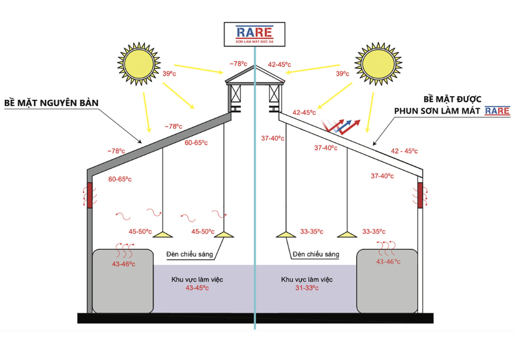 RARE giảm trên 30ºC cho bề mặt mái tôn và chênh lệch khoảng 10ºC so với sơn chống nóng khác. Giúp điều hòa, làm mát nhiệt độ không khí phòng, tiết kiệm được tối thiểu 30% điện nănglàm mát, đặc biệt vào mùa nắng nóng.