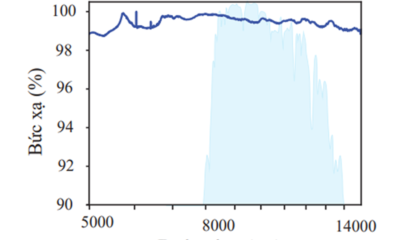 Đồ thị trên chỉ ra rằng: Sơn làm mát RARE sở hữu nhiều đỉnh bức xạ trong vùng 8 – 14µm (màu đỏ), chứng tỏ sơn RARE bức xạ nhiệt mạnh trong vùng này. Các bức xạ này không bị hấp thụ lại mà đi thẳng ra ngoài vũ trụ, dẫn đến mất cân bằng bức xạ, để có thể làm mát tới nhiệt độ không khí.